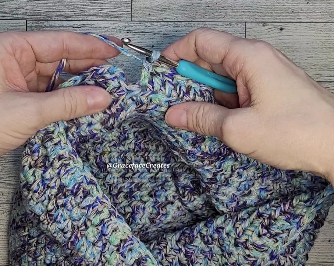 Weave the CH in & out of the final DC round of the dice bag (I wove through 2 DC at a time). Pull on both ends of the drawstring at the same time to close